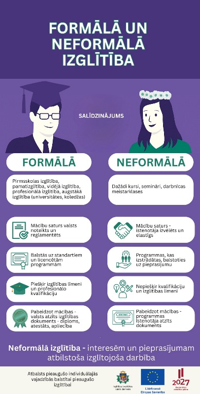 Mūsdienās arvien biežāk dzirdam jēdzienus formālā izglītība un neformālā izglītība. Sabiedrībā mēdz rasties jautājums – kas īsti tās ir un ar ko tās atšķiras? Šo jautājumu palīdz izskaidrot jaunā infografika “Formālā un neformālā izglītība”.