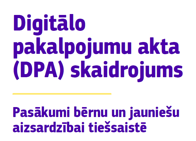 Digitālo pakalpojumu akts jeb DPA (Digital Services Act – DSA) ietver tam nepieciešamo noteikumu kopumu. Uz bērnu drošību tiešsaistē attiecas arī citi ES tiesību akti, taču šajā brošūrā galvenā uzmanība veltīta tam, kas ar DPA ieviests, lai aizsargātu cilvēkus, kas jaunāki par 18 gadiem (nepilngadīgos). digitālo pakalpojumu akta dpa skaidrojums-KK0323397LVN